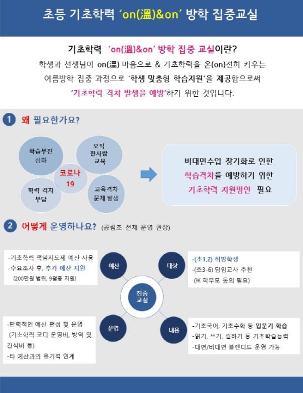 방학 집중교실은 온라인 수업 장기화에 따라 제기되는 학습격차 발생 우려를 해소하고 이를 적극적으로 예방하기 위한 것으로, 입문기 기초학력 보장이 필요한 초1~2학년 학생을 중심으로 하고, 3~6학년은 희망학생을 대상으로 방학 중 1~2주 정도 집중적인 학습지원을 제공하여 학교가 책임지고 학생의 기초학력을 키우겠다는 것이 핵심이다.