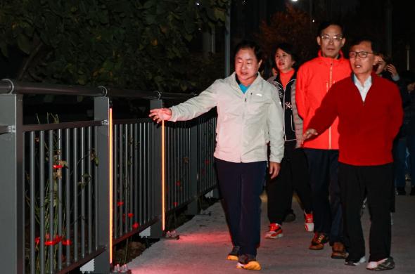 이날 주광덕 시장과 추진위원들은 왕숙천 둘레길 중 조성이 완료된 ‘장미 산책길’ 700m 구간을 함께 걸으며, 산책로에 설치된 경관 조명의 작동 상태 등을 면밀히 점검하고 향후 둘레길 활용방안에 대해 논의했다.