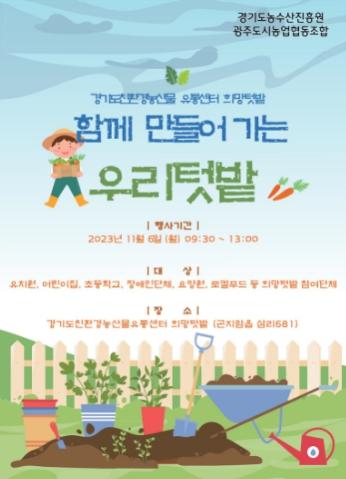 [한국뉴스타임=편집국] 경기도농수산진흥원은 오는 6일 오전 9시부터 오후 1시까지 광주시 곤지암읍에 위치한 경기도친환경농산물유통센터 내 희망텃밭에서 도시농업 프로그램 행사 ‘함께 만들어가는 우리텃밭’을 개최한다.