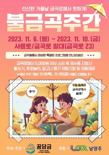 [한국뉴스타임=편집국] 남양주시는 오는 6일부터 10일까지 사릉로 및 금곡로 일대에서 금곡동 도시재생 뉴딜사업의 일환으로‘불금곡주간’ 행사를 개최한다고 밝혔다.