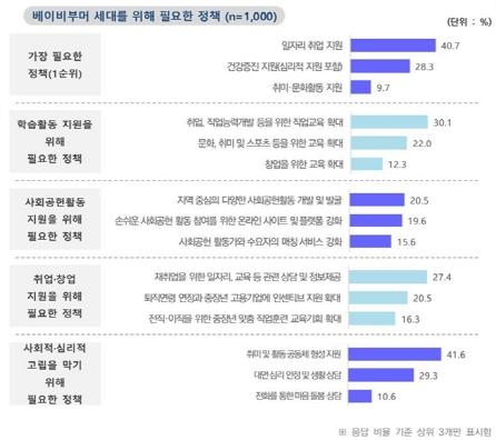 베이비부머 세대를 위해 가장 필요한 정책으로는 ‘일자리 취업 지원’이 40.7%로 가장 많았다.