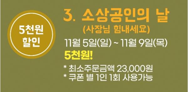 경기도주식회사는 5일 일요일부터 9일 목요일까지 총 15개 지역에서 ‘소상공인의 날 할인 이벤트’를 진행한다고 전했다. 이번 이벤트를 통해 최소 2만 3천 원 이상 주문 시 사용할 수 있는 5천 원 할인 쿠폰을 지급하며 이벤트 기간 중 회원 1인 1회 사용할 수 있다.