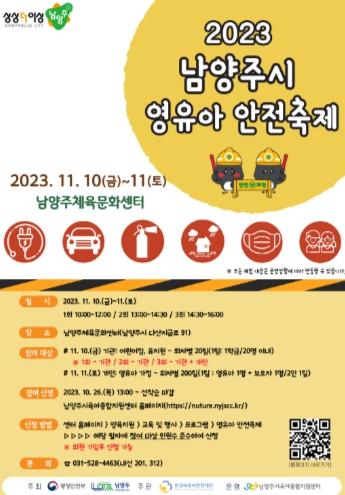 [한국뉴스타임=편집국] 남양주시는 오는 10일부터 11일까지 이틀간 남양주체육문화센터에서 관내 어린이집 및 유치원 등 영유아 기관, 영유아 가정을 대상으로‘2023년 영유아 안전 축제’를 개최한다고 6일 밝혔다.