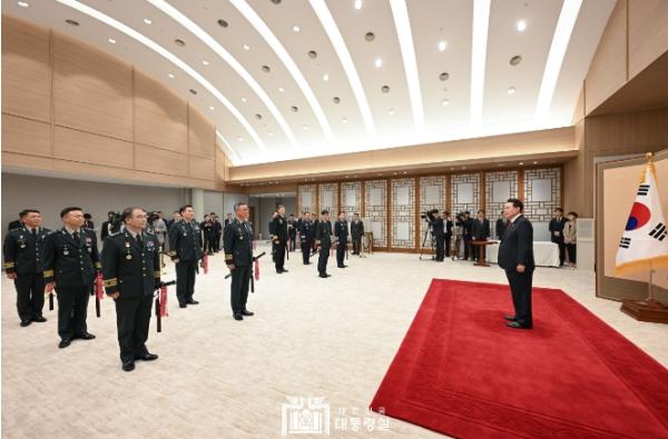 대통령은 군 중요직위자로 임명된 장군들의 삼정검에 직책을 명시한 수치(끈으로 된 깃발)를 달아주며 국가를 위해 더욱 헌신할 장군들을 격려했고, 함께 참석한 배우자들에게는 꽃다발을 전달한 뒤 기념촬영을 함께했다.