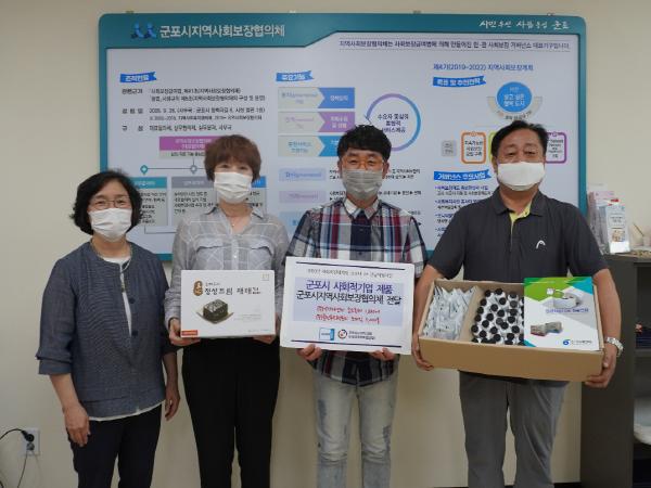 [KNT한국뉴스타임] 군포시 사회적경제·마을공동체 지원센터(센터장 권연순)는 지난 7월 9일 관내 사회적경제기업인 ㈜각시피앤시(대표 안교영), ㈜클린푸드팩토리(대표 이명숙)와 함께 군포시지역사회보장협의체에 코로나19로 어려움을 겪고 있는 긴급돌봄 필요 가정 등을 위해 써달라며 지원 물품을 전달했다.