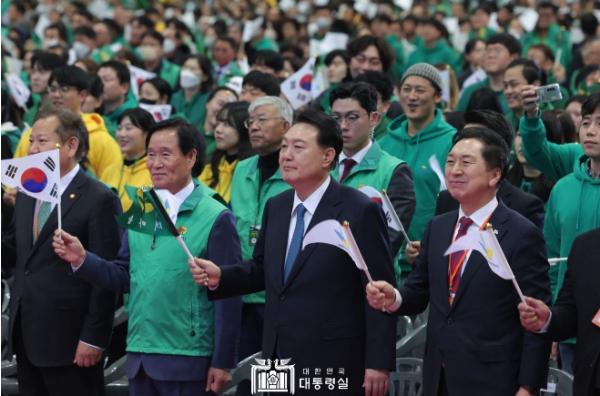 [한국뉴스타임=편집국] 윤석열 대통령은 11월 12일 오후 경기도 일산 킨텍스에서 열린 ?2023전국새마을지도자대회 ‘청년의 약속’ 선포식?에 참석해 새마을지도자와 청년새마을 회원들을 격려했다.