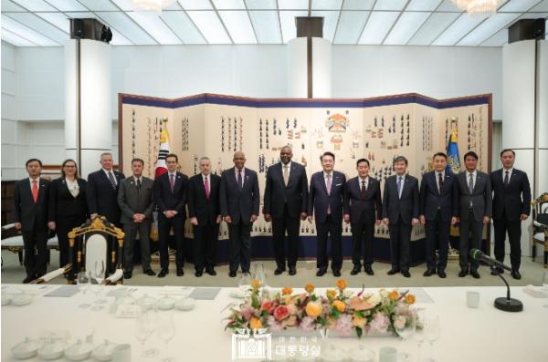 오늘 만찬에 미 측에서는 로이드 오스틴(Lloyd J. Austin Ⅲ) 국방장관, 필립 골드버그(Philip S. Goldberg) 주한미국대사, 찰스 브라운(Charles Q. Brown Jr.) 합참의장, 존 아퀼리노(John C. Aquilino) 인도태평양사령관, 폴 라캐머라(Paul J. LaCamera) 주한미군사령관, 일라이 래트너(Ely S. Ratner) 인태안보차관보 등이 참석했으며, 우리 측에서는 신원식 국방부장관, 조태용 국가안보실장, 김승겸 합참의장, 김태효 국가안보실 1차장, 인성환 국가안보실 2차장, 최병옥 국방비서관 등이 참석했다. "
