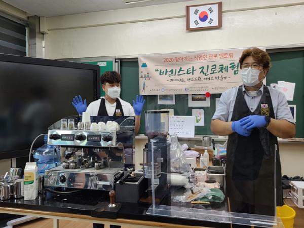 <2020 찾아가는 직업인 진로 멘토링>은 관내 군남중, 백학중, 청산중학교가 참여하여 지역에서 활동하고 있는 바리스타, 플로리스트, 화가, 아로마테라피스트, 캘리그라퍼 직업인을 초대하여 직업설명회를 갖고 직업체험활동을 진행하였다.