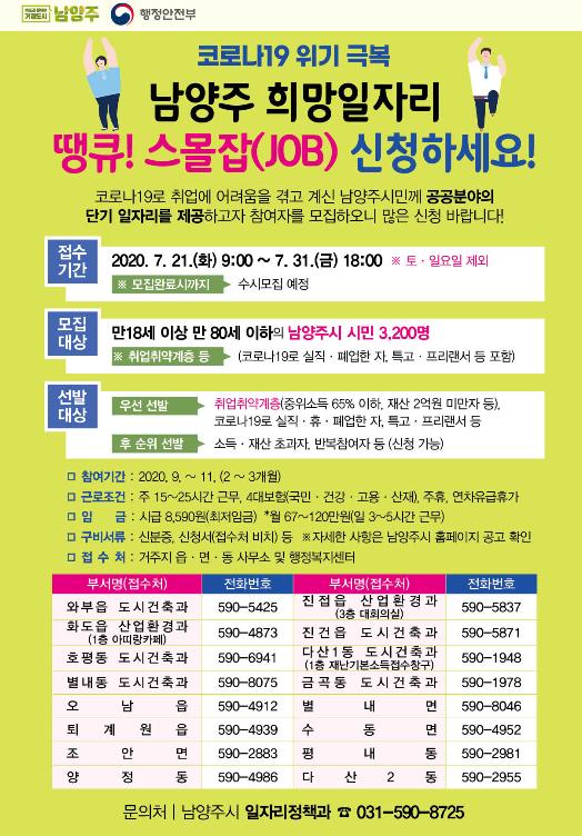 남양주시(시장 조광한)는 코로나19로 인해 취업 시장이 얼어 붙어 경제적으로 어려움을 겪고 있는 취업 취약계층을 대상으로 남양주시 희망일자리사업 ‘땡큐 스몰 잡’을 오는 7월 21일(화) 본격 추진한다고 밝혔다.