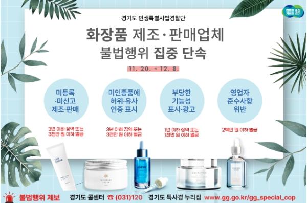 [한국뉴스타임=편집국] 경기도 민생특별사법경찰단이 11월 20일부터 12월 8일까지 도내 화장품 제조업체, 책임 판매업체, 맞춤형 화장품 판매업체 등 90개소를 대상으로 불법행위를 집중 단속한다.