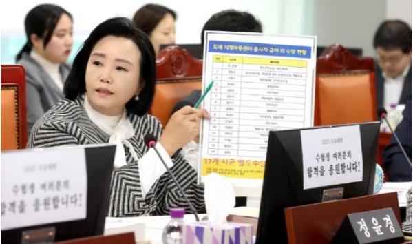 [한국뉴스타임=편집국] 경기도의회 여성가족평생교육위원회 정윤경 의원(더불어민주당, 군포1)은 15일 여성가족국(윤영미 국장)을 대상으로 한 2023년 행정사무감사에서 마을 돌봄의 한 축을 담당하는 지역아동센터와 관련한 질의를 하며, 종사자의 장기근속 중요성을 당부했다.