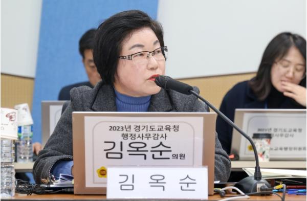 [한국뉴스타임=편집국] 경기도의회 교육행정위원회 김옥순 의원(더불어민주당, 비례)은 15일 실시된 경기도교육청 직속기관 교육복지종합센터, 율곡교육연수원, 평생교육학습관, 안전교육관, 5개 교육도서관(중앙, 과천, 성남, 화성, 의정부) 대상 2023년도 행정사무감사에서 학생들의 위한 문화예술 공연 확대를 주문했다.