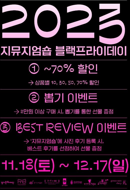블랙프라이데이의 이벤트 할인 행사는 뮤지엄 별 에코백, 스카프, 우산 등 대표 인기 상품과 신상품을 최대 70%까지 할인하여 판매한다. 특히 올해는 경기도미술관 ‘이건희컬렉션’ 상품과 실학박물관 ‘실감콘텐츠’ 상품 등 새롭게 출시된 상품이 모두 포함되어 더 풍성하고 다채로운 상품을 좋은 혜택으로 만나볼 수 있다. 또한 2만 원 이상 구매 고객을 대상으로 뽑기를 통해 선물(L홀더, 스티커 등 문구류부터 캔들과 러그 등 생활소품)을 증정하며 행사 기간에 사진 후기를 남겨주신 고객 중 ‘베스트 리뷰’를 선정하여 문화상품 꾸러미를 제공한다. 온라인숍 ‘지뮤지엄숍’에서 상품 구매 후 사진과 함께 후기를 남기면 자동으로 응모가 되고, 행사 종료 후 당첨자를 선발하여 발표한다.