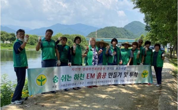이번 3분기 클린 코리아 캠페인에서 새마을회는 행랑객이 많이 찾는 자라섬 남도 주변 하천에 EM흙공을 투척하였는데, EM흙공은 살아있는 미생물로 황토 흙, EM활성액, 발효제를 섞어 반죽하여 공으로 만들어서 발효시켜서 사용하는데, 이 EM흙공을 하천에 투척하면 하천의 수질정화개선에 많은 도움이 된다.