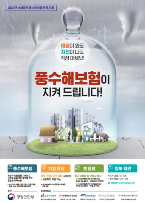 풍수해보험은 행정안전부가 도입한 정책보험으로 저렴한 비용으로 태풍, 홍수, 호우, 강풍, 풍랑, 해일, 대설, 지진 등의 피해를 보상하는 제도이다.