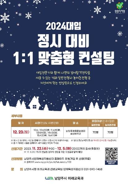 [한국뉴스타임=편집국] 남양주시는 오는 22일부터 내달 5일까지 ‘2024학년도 대입 정시 대비 1:1 맞춤형 컨설팅’참여자를 모집한다고 밝혔다.