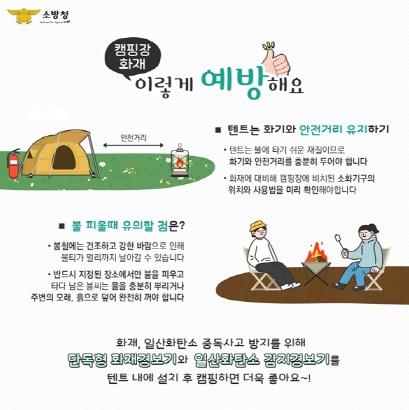 주요 안전수칙으로는 ▲화기 사용 시 텐트 등 가연물이 되는 물체와 충분한 안전거리 두기 ▲화재에 대비해 캠핑장에 비치된 소화기구의 위치와 사용법 미리 확인하기 ▲반드시 지정된 장소에서만 불을 피우고 타나 남은 불씨는 완전히 소화하기 ▲텐트 내 단독형 화재경보기와 일산화탄소 감지경보기 설치하기 등이다.