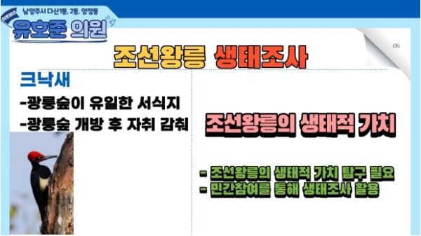 유호준 의원은 “크낙새가 남양주시 광릉 숲에서 1993년 마지막으로 발견된 뒤 자취를 감췄다.”며 사라져버린 남양주의 시조인 크낙새에 대해 언급한 뒤 “그만큼 광릉 같은 오래 보전된 조선왕릉의 숲에는 여러 생태계 동식물이 살고 있을 것이라 예상된다.”라며 조선왕릉의 숲에 살고 있을 다양한 생태계 동식물에 대해 강조했다. 이어서 “이렇게 높은 생태가치가 있을 것으로 예상되는 조선왕릉의 숲을 대상으로 문화재청과의 협의를 통해 민간참여형으로 생태조사 계획을 세울 필요가 있다.”라며 조선왕릉의 생태가치를 분석하기 위한 조사를 촉구했다.