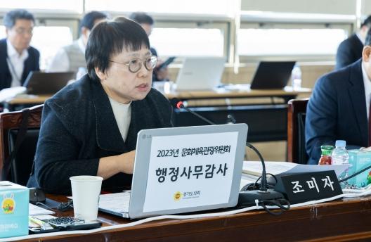 끝으로 조 의원은 “지난해 문화체육관광국에서 직접사업으로 추진한 거리로 나온 예술, 작은축제, 문화의 날 사업들은 도민이 체감할 수 있었다”고 소회를 밝히며, “경기도가 31개 지역의 보물같은 구술을 꿰는 실의 역할을 하기 위해서는 문화자치 활성화가 중요하며 이를 위해 문체국 산하기관의 실무를 담당하는 본부장급의 협의체를 구성하여 경기도 문화 정책 및 사업 공유와 예산의 효율적 집행”을 당부했다.