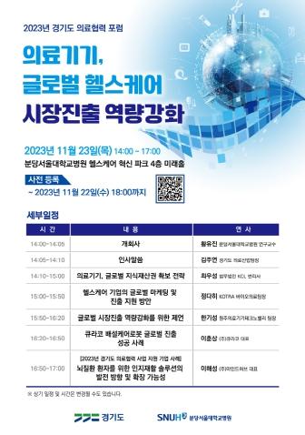 [한국뉴스타임=편집국] 경기도가 23일 분당서울대학교병원 헬스케어혁신파크 미래홀에서 ‘의료기기, 글로벌 헬스케어 시장진출 역량강화’를 주제로 경기도 의료협력 정기포럼을 개최한다.