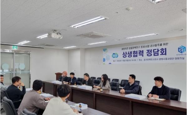 경기주택도시공사(GH)는 22일 경기도 광명학온 공공주택지구 조성사업 현장에서 설계품질 향상, 사업 추진일정 적기준수 등을 위한 ‘상생협력 정담회’를 개최했다고 밝혔다.