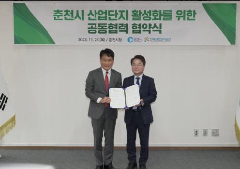 시는 23일 오전 11시 45분 춘천시청 접견실에서 한국산업단지공단(이사장 이상훈)과 춘천지사 유치를 주요 내용으로 하는 ‘춘천시 산업단지 활성화를 위한 공동협력 협약’을 체결했다고 밝혔다.