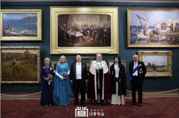 [한국뉴스타임=편집국] 윤석열 대통령 부부는 현지시간 11월 22일 수요일 저녁 런던 길드홀에서 런던금융특구(City of London) 마이넬리 시장(Lord Mayor)이 주최한 만찬에 참석했다. 이날 만찬은 런던금융특구의 본청인 길드홀(Guild Hall)*에서 3시간 가량 진행됐습니다. 만찬에는 영국에서 활동하는 우리 경제인들과 동행하는 경제사절단이 참석했으며, 영국 측에서는 런던금융특구 시의원, 왕실 인사 및 런던의 주요 경제·금융인들이 함께 했다.