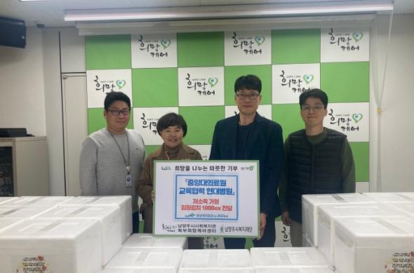 [한국뉴스타임=편집국] 남양주시 진접읍 소재 현대병원은 지난 22일 김장철을 맞이해 500만 원 상당의 김장김치 100박스를 남양주시사회복지관 북부희망케어센터에 전달했다.