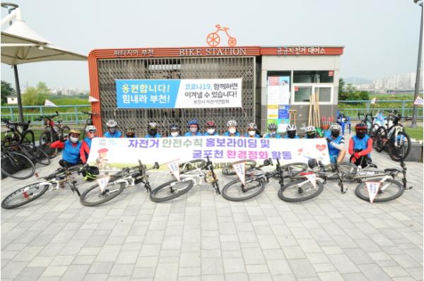 이날 행사는 마스크 착용의 중요성과 필수 생활 수칙을 다양한 수단을 활용해 알리기 위해 자전거연합회 회원 20여 명이 참석해 전단 배포, 현수막 게첨, 굴포천 건강길 환경정화 활동 등을 통해 코로나19 극복에 앞장섰다.