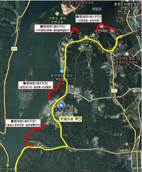 통제 구간은 의암호 순환 코스 4개소 2.62km로 ▲제1구간: 의암공원 야외공연장 입구 ~ KT&G 상상마당춘천 인근(0.45㎞) ▲제2구간: 삼천동 구)중도선착장 앞 ~ 중도물레길 입구(0.37㎞) ▲제3구간: 삼천 낚시터 입구 ~ 송암동 수상협회 입구(0.8㎞) ▲제4구간: 송암스포츠타운 ~ 김유정문인비(1㎞)이다.
