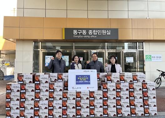[한국뉴스타임=편집국] 구리시 동구동 행정복지센터는 지난 30일 ㈜삼호썬샤인(대표 김광섭)로부터 동구동 취약계층 가구를 위한 사랑의 김장김치 100박스를 전달받았다.