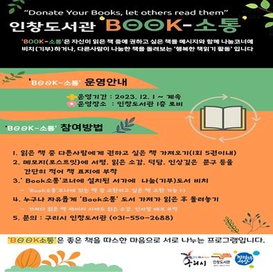 인창도서관 ‘BOOK-소통’ 코너는 읽고 난 책을 나누고 교환할 수 있는 공간으로, 국제적 독서문화 활동인 ‘북크로싱(book crossing)’ 운동을 모티브로 삼아 시민들이 서로 책을 돌려보면서 자원 재활용을 통한 환경보호에도 동참할 수 있도록 하기 위해 마련됐다.