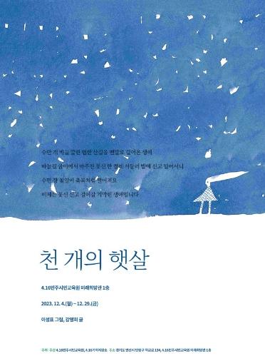 4.16민주시민교육원(원장 전명선)은 4일부터 29일까지 교육원 미래희망관 1층에서 ‘천개의 햇살’ 작가 합동 그림 전시회를 개최한다고 밝혔다.